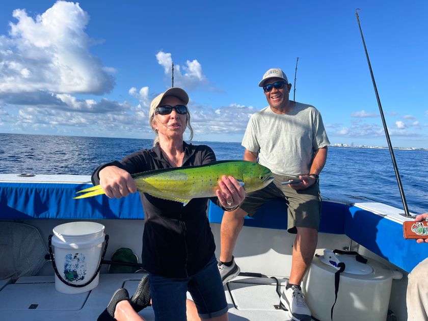 Gregor brought his family out today for some fishing and the trolling out produced the drift fishing. We headed offshore this morning and for the first hour it was pretty quiet with just a lost bonita to show for our efforts. I was starting to think about shifting gears when we hooked up to a Mahi. We got that one in the boat and then started hooking mahi every 10 minutes or so. This made for some pretty good action, we boated 4 and lost one due to angler error ! Then we went on the drift, boating some porgies, grunts and other reef fish. It was a beautiful day on flat calm seas, welcome to Palm Beach !